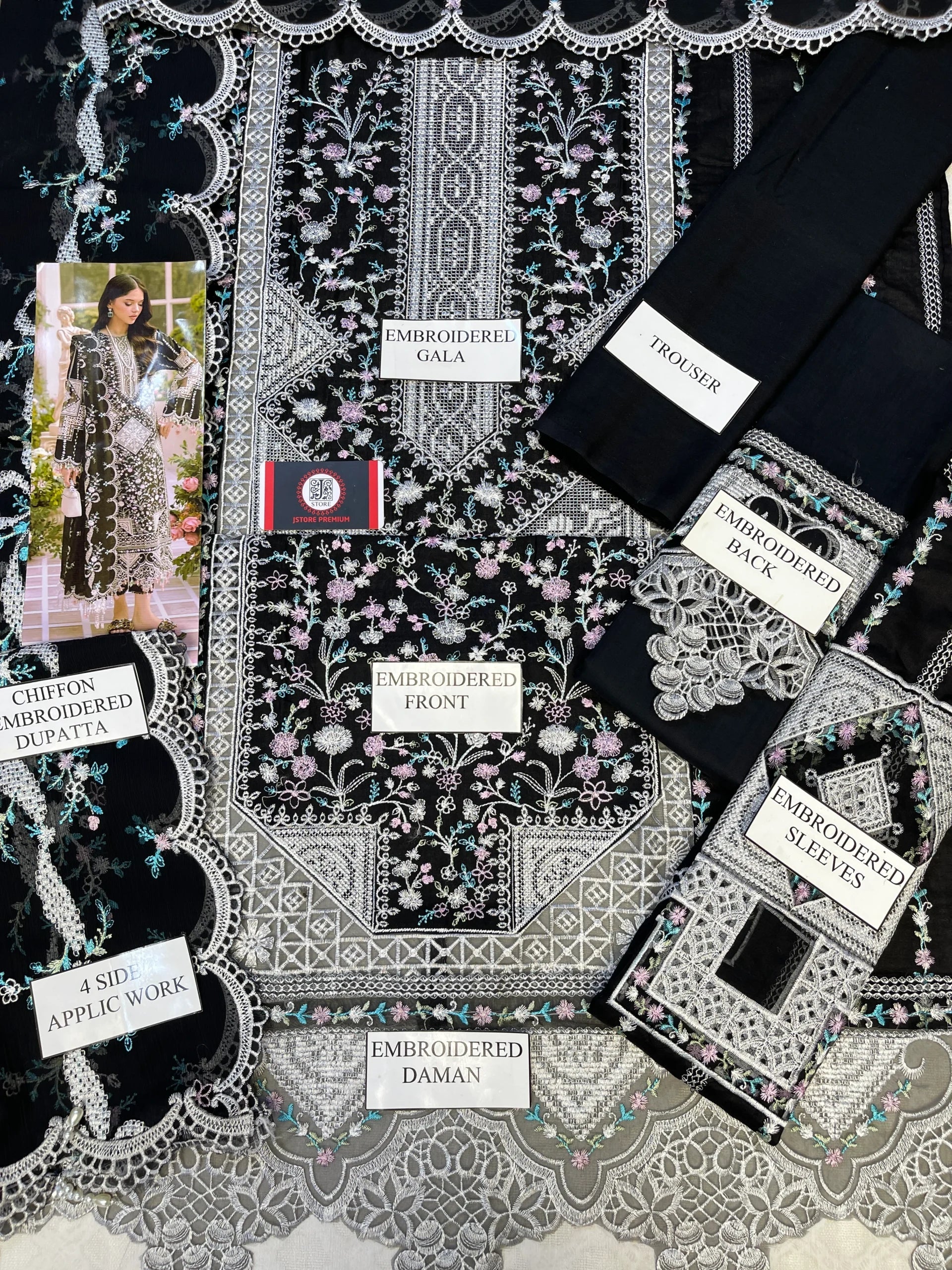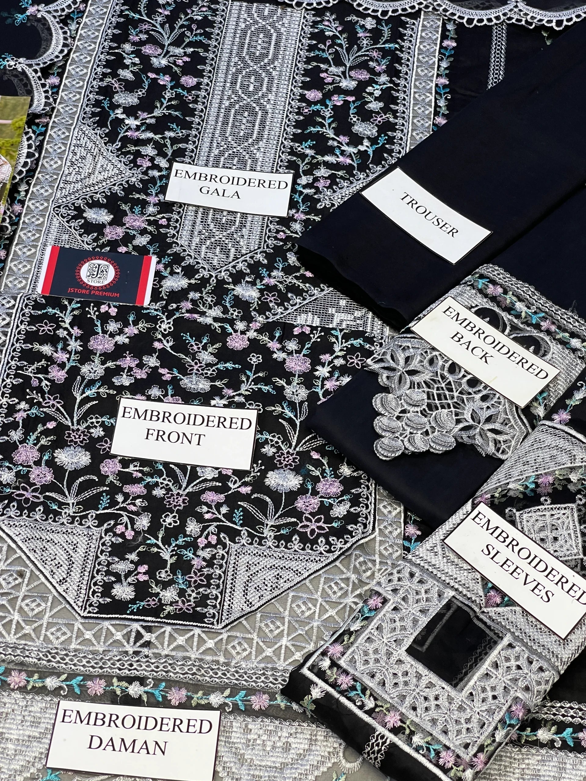 •THREAD EMBROIDEDAND FRONT COMBINATION CUTWORK PANELS ON BOTH SIDE ALONG WITH DAMAN BORDER (CROSS STICH EMBROIDERY)