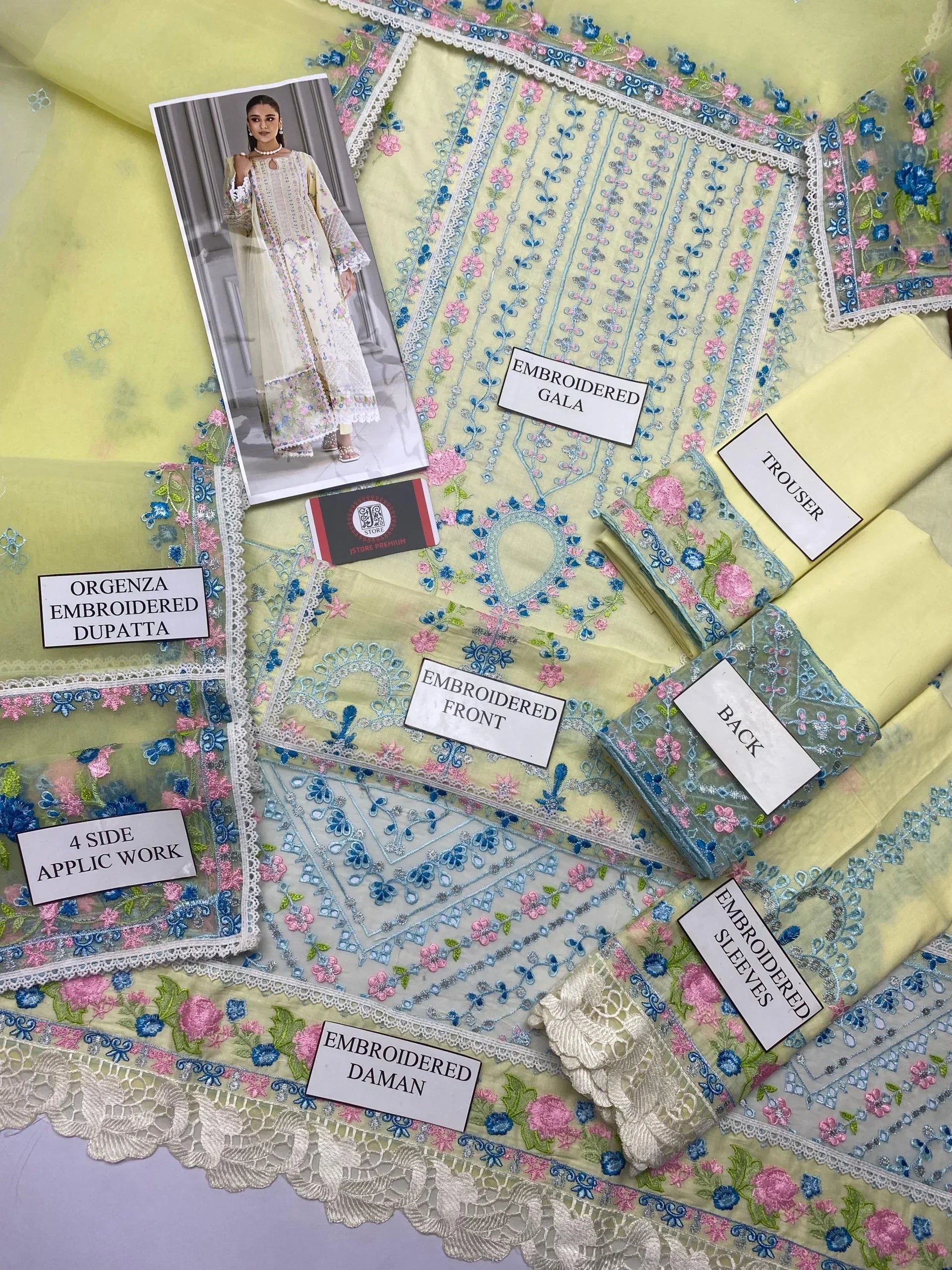 * schiffli multi thread embroidedand printed front combination of multi thread work and laces work along with embroided daman attached